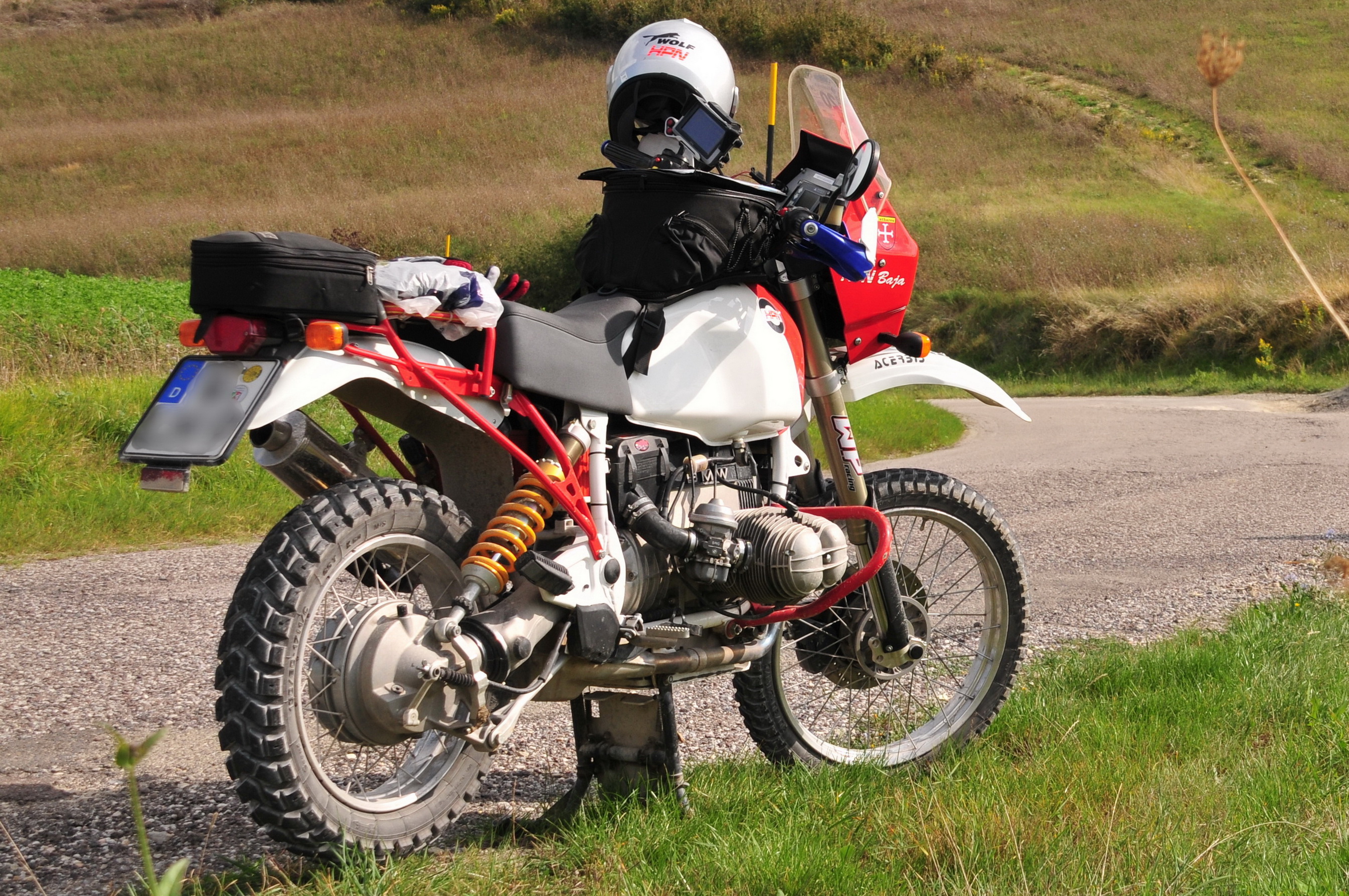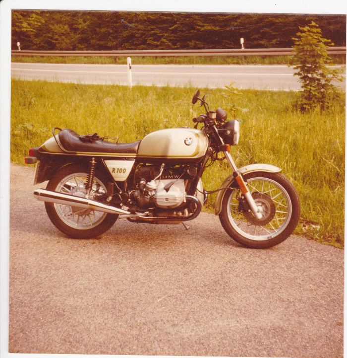 Lach mich nicht aus, aber ich denke beim Konzept an die Figur des Löwenmännchens, das im Krügerpark neben dem Auto her trottete: Vorne die Mähne und hinten sehr schlank. Heißt erstmal den hinteren Kotflügel optisch minimieren: Eine Farbunterkante noch oben laufen lassen, so daß sie an die Sitzbankunterkante anschließt. Unter dieser Farbunterkante wird er mattschwarz. Meine R100 von einst zeigt es: Die Sitzbankunterkante setzt sich am Tank farblich fort, der darunter mattschwarz „verschwindet“ und kleiner wird. Mein Mopped muß nicht gefallen, ich möchte mit dem Bild nur die Wirkung von Farbgrenzen zeigen.
