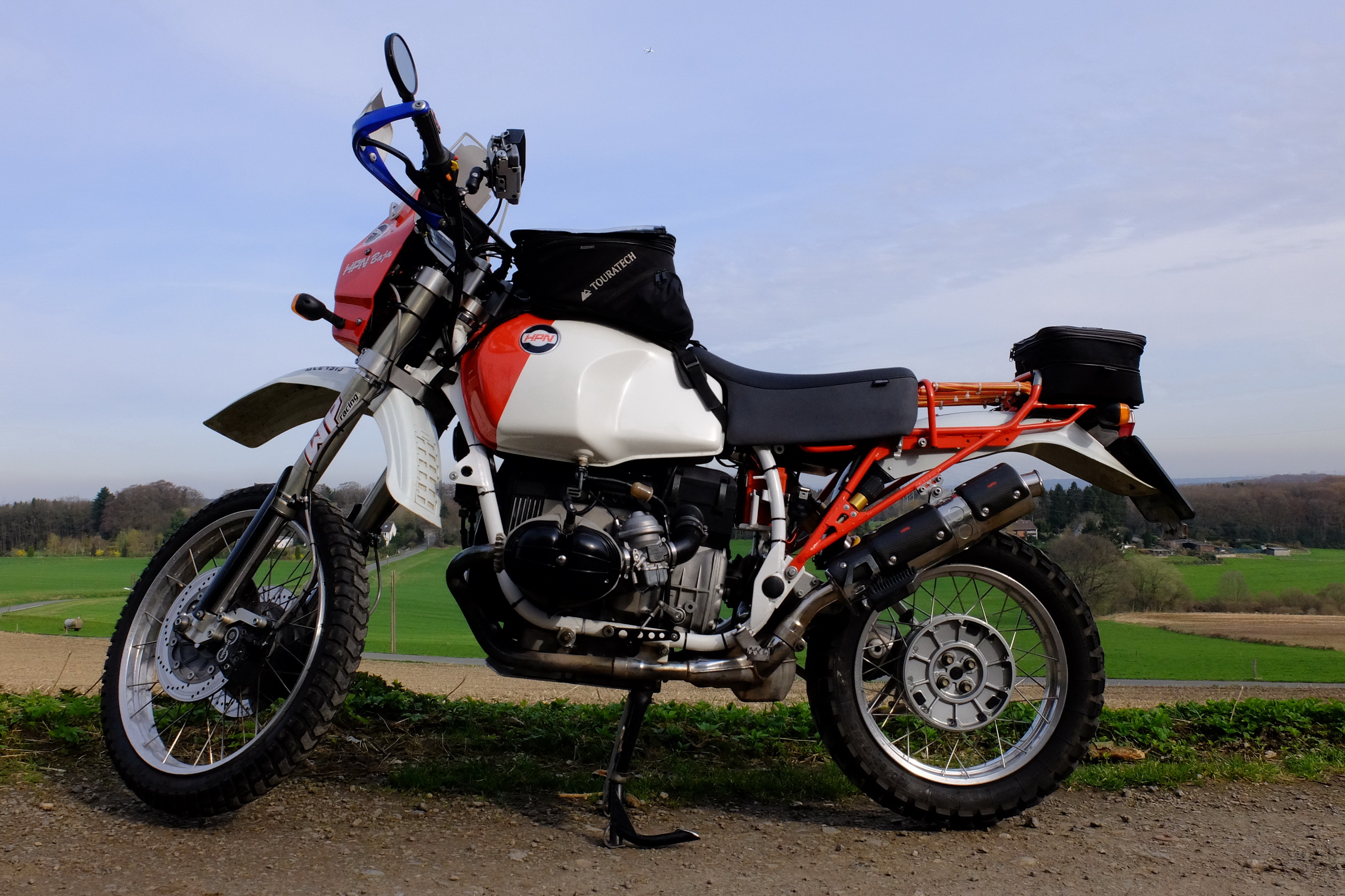 Nach vorne könnte ich mir vorstellen das Weiß der Bank in gleicher Höhe am Tank in der Richtung von dessen Unterkante, also schräg nach unten, nach vorne auslaufen zu lassen. Darüber eine Farbe für alles, die rote Linie dazwischen ist überflüssig. Die Aufkleber, z.B. das Dakar-Emblem ? Fährt schon 100.000 mal rum ! Der vordere Kotflügel ist zu klein für Malerei, also in „Wagenfarbe“, fertig. Die rotschwarze Malerei an der Front ? Nur wenn Du sie in die Geisterbahn stellen willst, gleich neben dem Gerippe ;-). Da muß uns noch etwas Pfiffigeres einfallen.