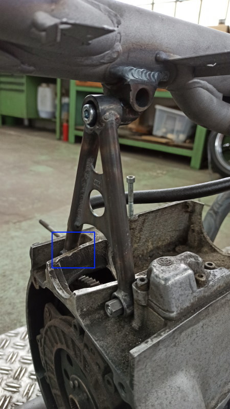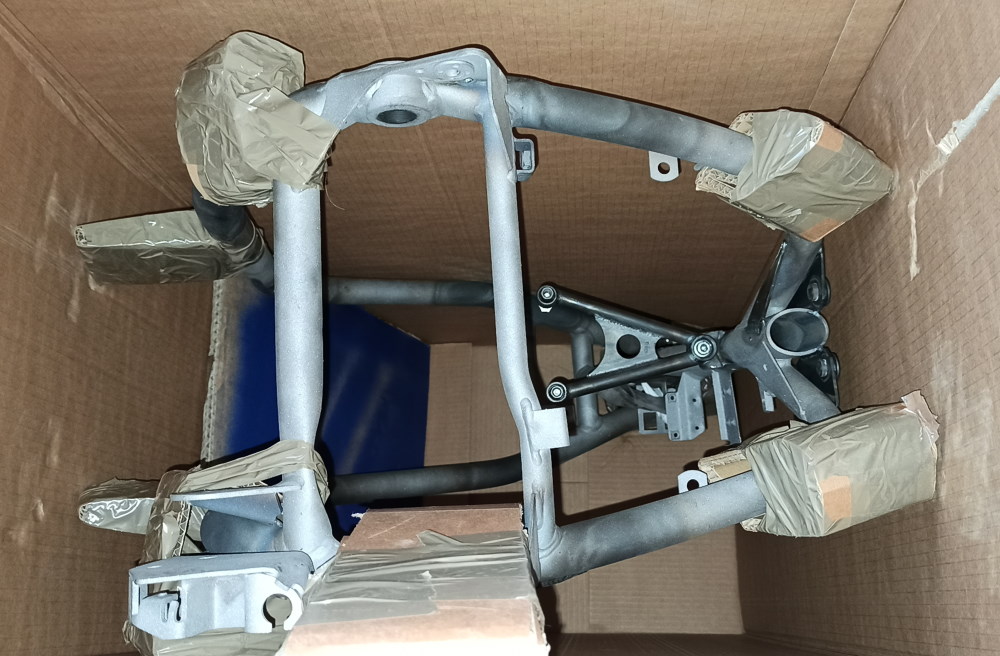 Aus diesem Grund war schon relativ früh klar, dass der Motor höher gelegt werden muss. Da ich schon lange mit 2 Rahmennummern auf der Warteliste bei HPN stehe, wurde aus einer HPN-Sport-Bestellung eine Serienrahmenverstärkung gemacht (aber mit Motorhöherlegung und 3. Motorlager zum Oberrohr).