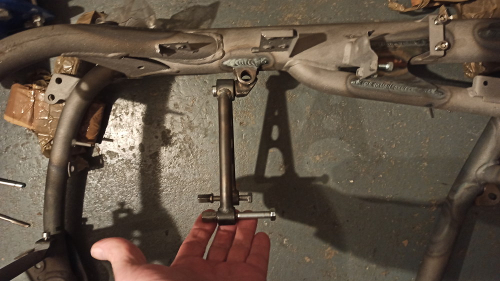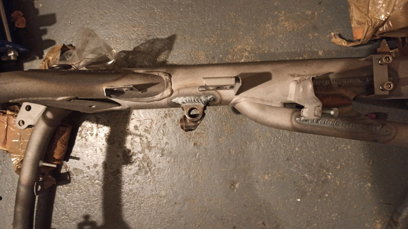 Heute noch ein paar restliche Anpassungsarbeiten am Rahmen erledigt. Der leichte (ca.750g, ohne den Ölcatchtank etc.) Aluheckrahmen wurde probehalber montiert. Past alles sehr gut. Ich muss nur ein paar andere Hülsen drehen, aber es sind sonst keine Änderungen notwendig. Daher ist der Rahmen heute zum Kunststoffbeschichter gegangen.