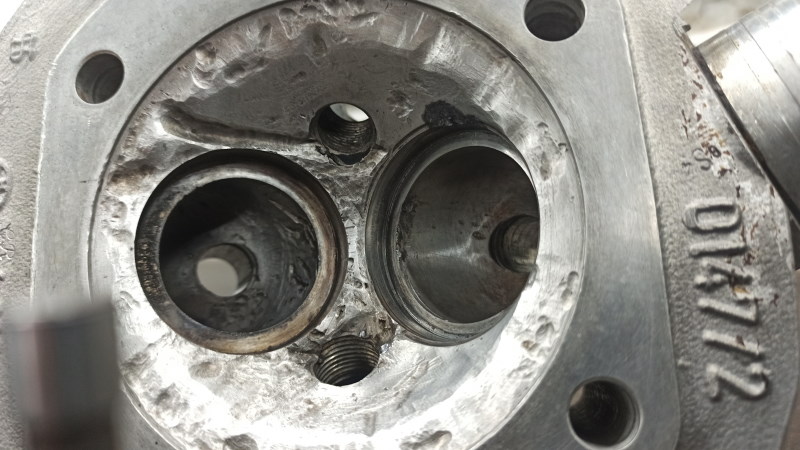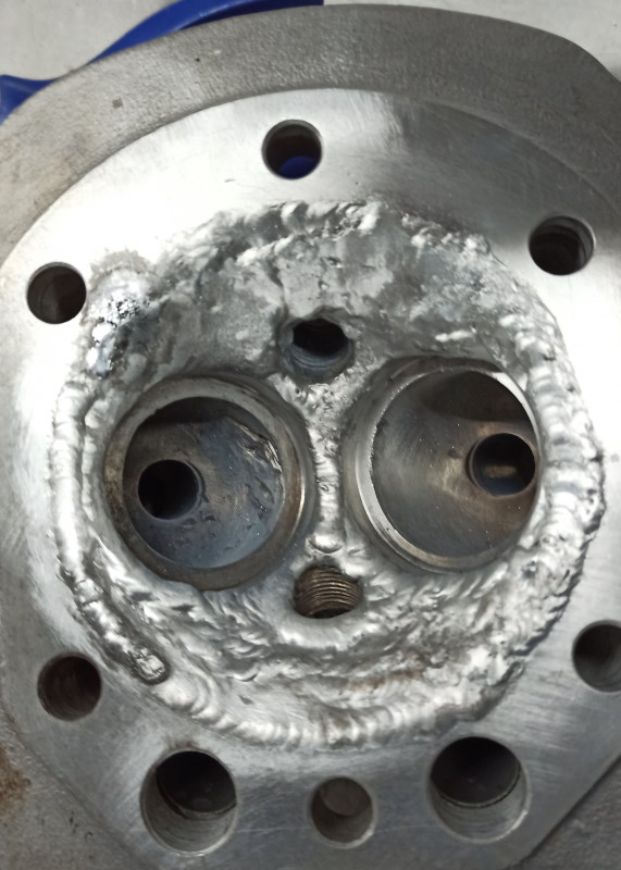 vielleicht täuschen die Bilder ein wenig. Durch das Aufschweißen ragt Material über die alten Bohrungen. Daher sieht es unrund aus. Das ist aber kein Problem, da die Bohrung sowieso überabeitet wird. Die Anlagefläche der Sitze und die Bohrungen für die Führungen sind nicht verändert und sollten daher passen.