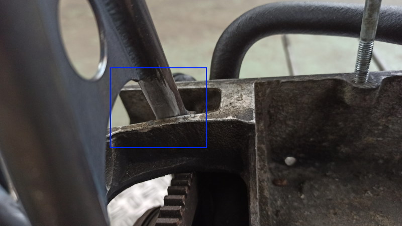 Da hat Hansen recht. Das Auge ist am Oberrohr angeschweißt. Es sieht fast aus, wie eine zweckentfremdete Motorhalterung von unten. Hier einmal ohne den Halter und dann mit Halter