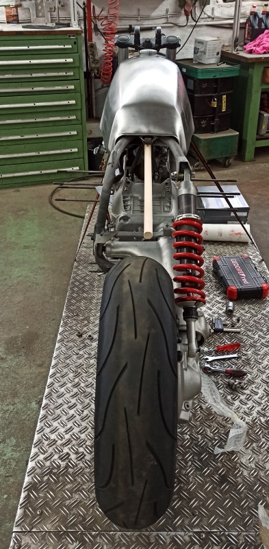 Ich habe auch mal einen Tank und eine R100R Gabel drangesteckt. Die Mitte hab ich mal provisorisch mit einem Buchenstab versucht zu simulieren. Momentan sind es noch ca. 25mm. Aber das Hinterrad kommt noch ca. 10mm nach rechts. Dann bleiben ca. 15mm übrig. Mal sehen wie es ist, wenn alles final zusammen ist. Das wird aber noch etwas dauern.