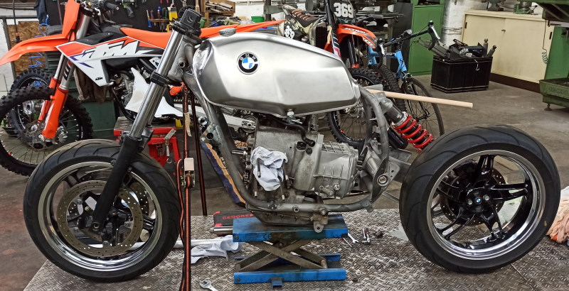 Warum Schweizer Taschenmesser? Der Rahmen ist ursprünglich aus der Schweiz mit 88er Baujahr und das Moped könnte später auch problemlos wieder eine Enduro werden. Der Rahmen und das Fahrwerk geben das problemlos her. Hinten wird wegen der Bodenfreiheit sowieso ein GS Federbein verbaut und die Gabel ist auch relativ lang (820mm von Achse bis Oberkante Gabel). Das Moped soll zwar rennstreckentauglich sein, aber auch eine Straßenzulassung bekommen. Daher Schweizer Taschenmesser.