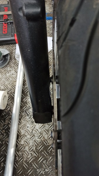 Man sieht aber auch, dass es dann an anderen Stellen eng wird. Das zeigt ein Blick von hinten an der Schwinge entlang. Das Halteblech für die hydraulische Fussbremse habe ich parallel zur Schwinge beschliffen. Das ist für mich jetzt das Maximum. Das sieht man auch später an der Motorposition.