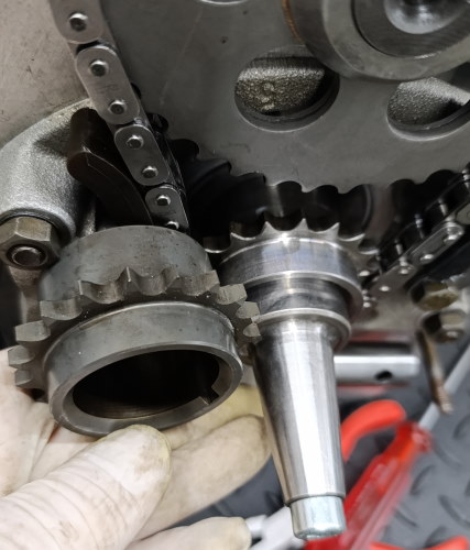 Das neue Kettenrad auf der Kurbelwelle hat mich etwas Nerven gekostet. Habe mit 100°C angefangen. Das Rad ging nur ein paar mm auf die Welle. Mit dem Kuko 3-Armabzieher ging das Rad wieder runter.