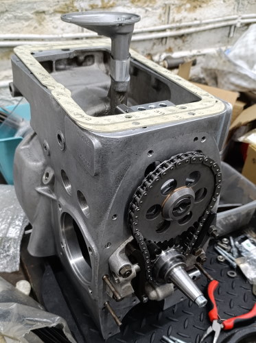 Die Zylinder und Kolben wurden montiert, der Quetschspalt erneut geprüft, für OK befunden und die Kanäle noch ein wenig bearbeitet. Der Distanzring und die Ölwanne sind nun auch montiert.