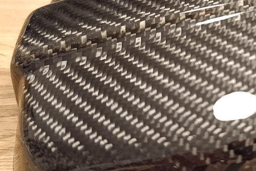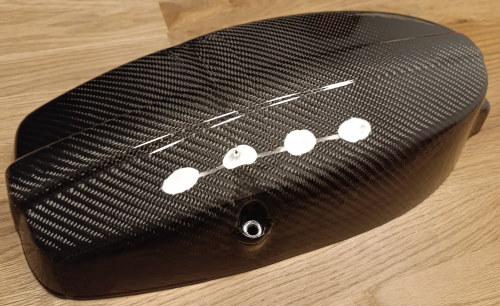 Also habe ich versucht das restliche Deckschichtharz runter zu schleifen und dann den Deckel mit 2K-Klarlack neu lackiert. Ich bin begeistert und finde, dass sich die Arbeit gelohnt hat. Leider kann man nun sehen, dass die Carbonfasern im Bereicht der Schraublöcher nicht sauber verlaufen. Aber das kann ich gut verkraften.