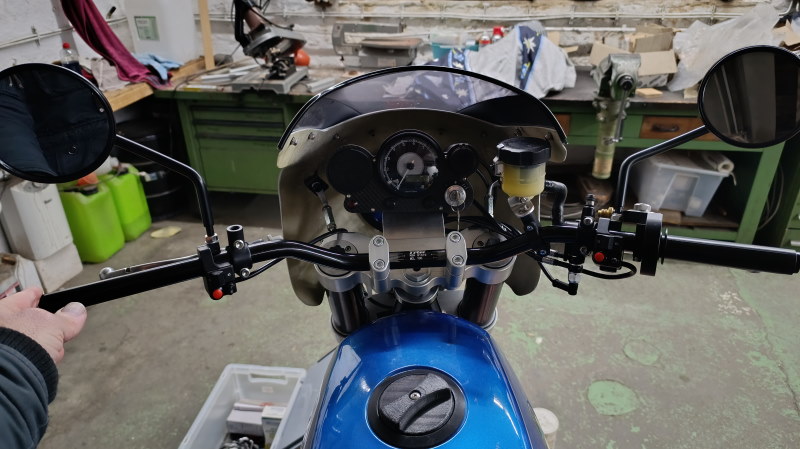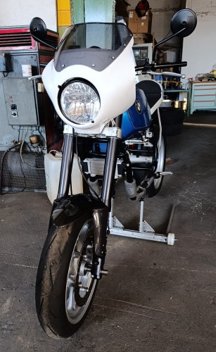 Hab mal an dem vorderen Bereich ein paar Dinge provisorisch zusammengebaut. Verkleidung und die Scheibe müssen nochmal erneuert werden, da die vorhandenen Teile durch den damaligen Sturz in Mitleidenschaft gzogen wurde. Somit habe ich dann 1 Satz für die Straße mit Scheinwerfer und einen Satz ggf. für die Rennstrecke ohne Scheinwerfer.