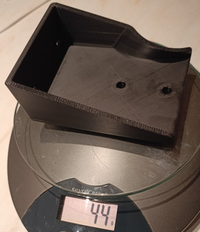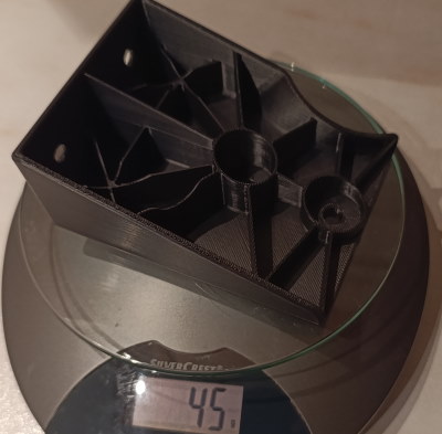 Dann habe ich eine Version mit dem 3D Drucker mit Verstrebung nach unten hergestellt und 4mm Wandstärke erstellt. In diese Richtung war es eine deutliche Verbesserung. Aber seitlich ließ sich die Halterung immer noch verwinden. Klar, in der Richtung fehlen die Streben.