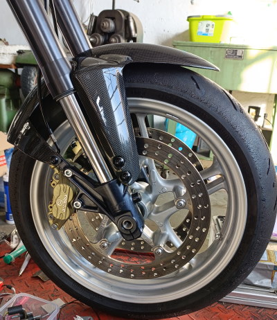 Der Kotflügel ist auch dran. Der Abstand zum Reifen ist etwas größer, als bei dem Kunststoffteil. Aber in Verbindung mit der UpSideDown-Gabel und der großen Bremse sieht das schon ganz gut aus.