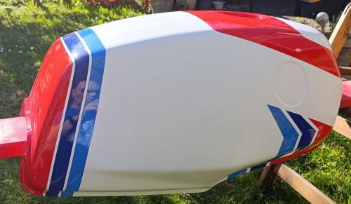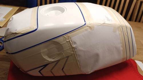 Das Design des Trainingsanzugs (mit 3 Streifen ) nimmt auch Gestalt an, bringt aber auch auch ein paar Schwierigkeiten mit sich. Es sind ein paar Fehlstellen dran und der 1K-Lack der Streifen scheint nicht richtig auszuhärten. Sobald er warm wird, wird der Lack weich. Jetzt lasse ich ihn erstmal ein paar Tage stehen. Vielleicht geht es dann. Es soll auch noch ein 2K-Klarlack drüber.