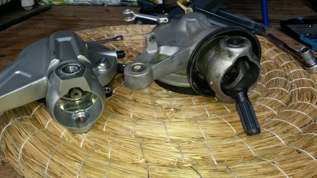 Ich habe nun den Endantrieb abgeschraubt und dachte ich kann den neuen Endantrieb von der 850ger einfach draufstecken. Aber das funktioniert nicht, da die "Welle" die aus dem alten Antrieb schaut viel länger ist, als beim neuen (vgl. Foto). Muss ich da was vom alten Antrieb übernehmen? Wenn ja, wie bekomme ich das Teil ausgebaut und am neuen Antrieb angebaut?