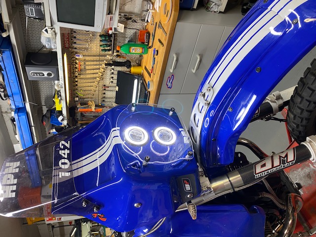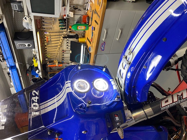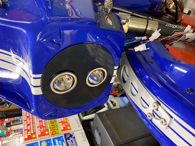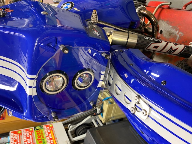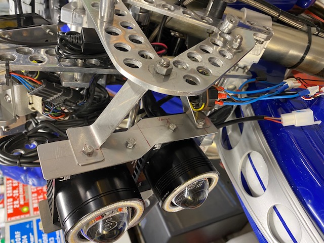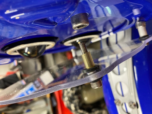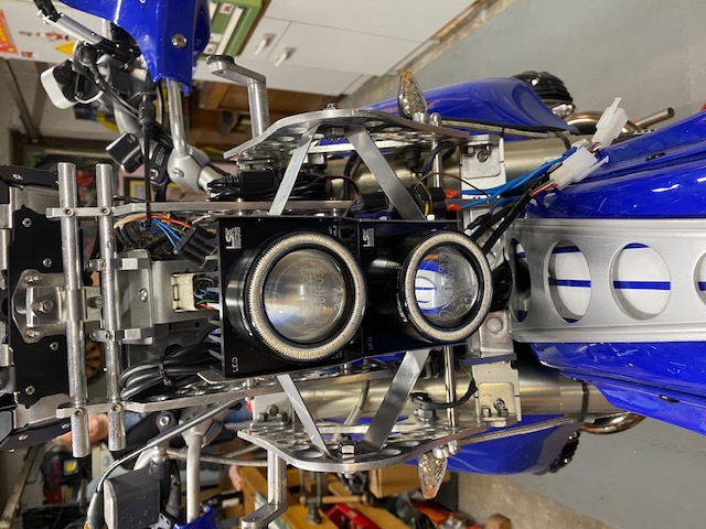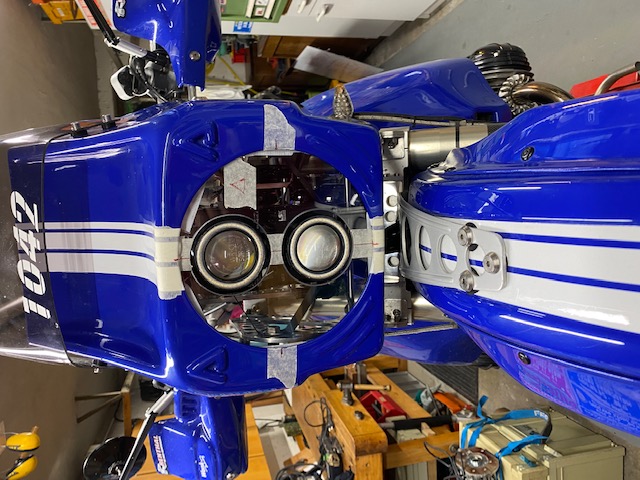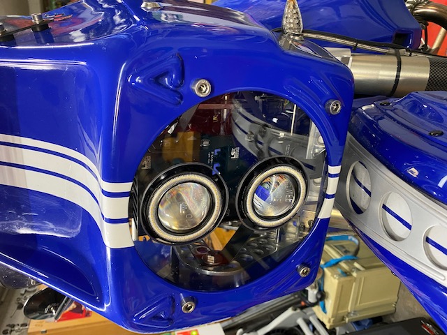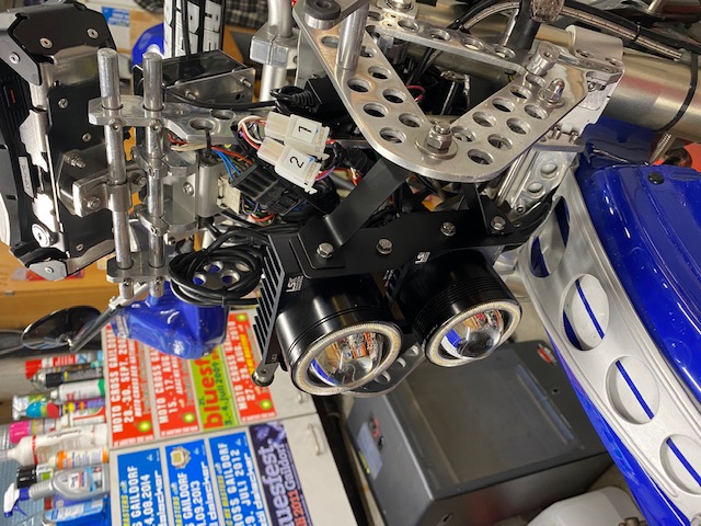 So hier geht es zum Endspurt, habe die Feiertage etwas genutzt. Nachdem die Scheinwerfer befestigt und verkabelt wurden, ging es an die Maske. Für den Ausschnitt des alten Scheinwerfers fertigte ich eine Abdeckung aus 4mm Plexiglas. Das Knifflige an der ganzen Sache war, diese genau zu positionieren damit die beiden Löcher für die Scheinwerfer auch mittig (vertikal) zu den Lampen steht. Die beiden Löcher für die Scheinwerfer habe ich mit einer Handoberfräse ausgefräst, hierfür fertigte ich eine Schablone aus 10mmMultiplex. Bei der Außenkontur (nicht ganz gleichmäßig) muss ich noch etwas nachbessern damit diese noch besser zur Kontur der Maske passt (Ist rein Optisch im Inneren). Denn durch das positionieren der Scheibe (Lampenmitte und Befestigungspunkte Maske) sind die Abstände nicht ganz gleichmäßig. Mit Doppelseitigem Klebeband wurde die Scheibe innen fixiert und die vorgebohrten Löcher an der Maske für die Befestigung auf die Plexiglasscheibe übertragen. Diese wurde mit der fast farblich passenden Folie beklebt (war nichts anderes da, kann aber jederzeit geändert werden) und mit vier M8 Inbusschrauben befestigt, die ich zuvor holgebohrt und mit einem M5 Gewinde versehen habe. Hier kann dann die vorgesetzte Scheibe (Steinschlagschutz) befestigt werden. Hier hab ich mich an Jens seiner Konstruktion orientiert, fand ich die beste Lösung (holgebohrte Schrauben). Damit die Abstandshülsen der Scheibe immer schön Mittig sitzen wurden PVC Schläuche über die M5er Schrauben geschoben.