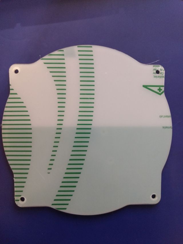 hier ein Foto von der HPN Plexiglasscheibe. Bitte nicht wundern. Da sie noch nicht verbaut war, ist immer noch die Schutzfolie drauf. Sieht irgendwie aus, wie ein Katzenkopf