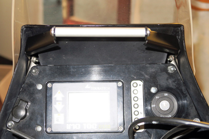 Hallo! Ich wollte schon immer das Navi vom Lenker weghaben, und zwar dahin, wo es hingehört: Ins Blickfeld, oberhalb der Instrumente. Meine Lösung möchte ich euch hier zeigen. Ich habe mir dafür den GPS-Anbauadapter 01-045-5415-0 von Touratech (39,90 €) geholt, der eigentlich für die neue R1200GS(LC) vorgesehen ist. Der passt mit einer Breite von ca. 25 cm ganz prima. Aber das Beste: Der Abstand der kleinen Löcher auf den schwarzen Seitenteilen des Adapters beträgt 38 mm, genau der Lochabstand der Armaturenbrett-Windabweiser-Befestigung an der HPN-Lampenmaske (siehe Bild 1)! Zunächst muss aber jeweils eine umgebogene Lasche an den Seitenteilen abgeflext werden (siehe Bilder 2 und 3), damit die Seitenteile von innen in die Riefe der Lampenmaske hineinpassen. Das habe ich mit dem Dremel erledigt, dann die Flexkanten glatt geschliffen. Dann müssen die Seitenteile etwas um die Langachse gebogen werden, um den seitlich fliehenden Winkel der Lampenmaske auszugleichen (siehe Bild 4). Dann etwas schwarzen Lack auf die Flexkanten, da habe ich einfach schwarzen Hammerit genommen, da bin ich nicht so pingelig. Auf den letzten beiden Bildern seht ihr den fertig eingebauten Zustand. Auf das 12 mm- Aluquerrohr werde ich mir jetzt meinen Zumo montieren, wahrscheinlich mit dem Touratech-Halter, wenn der wieder lieferbar ist...
