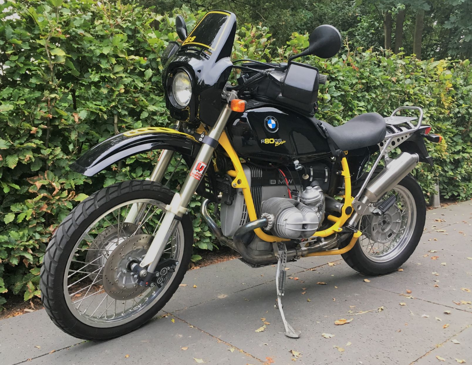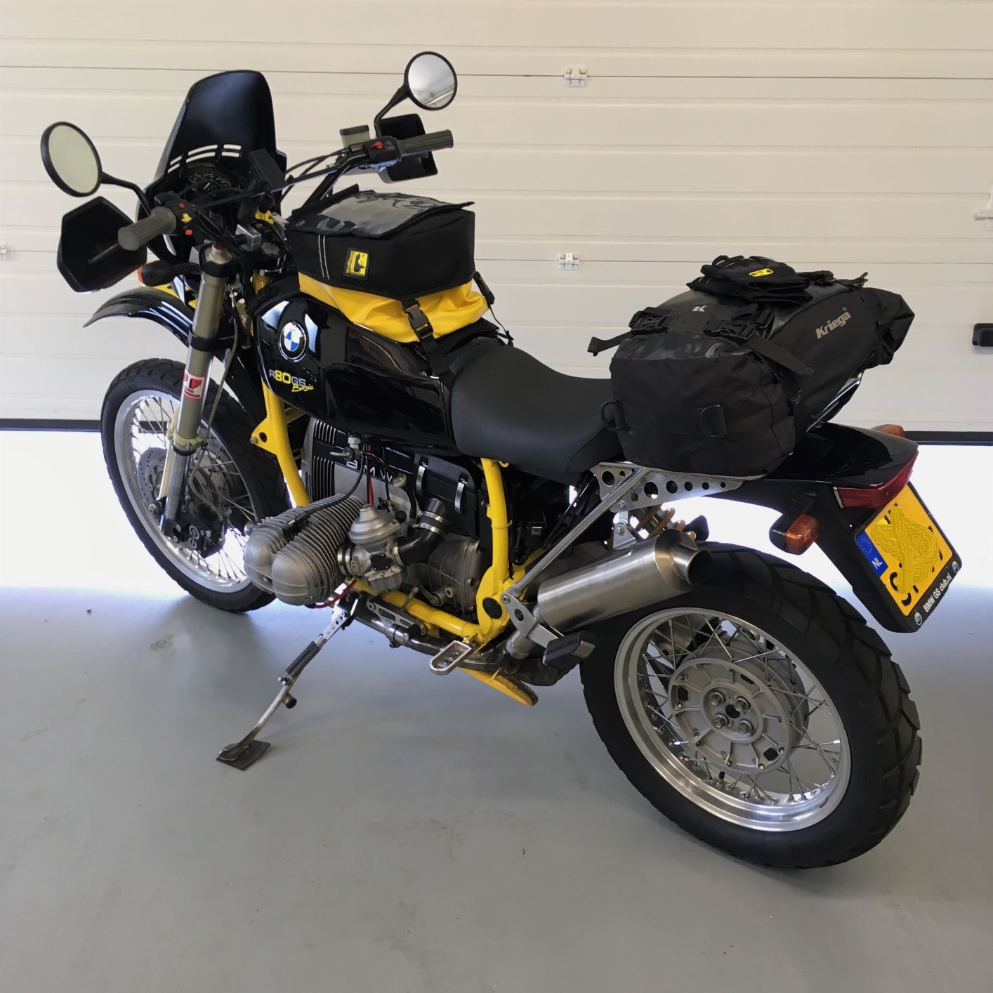 #171 I bought this HPN bike in september 2016 from a really nice man in Unna. #171 started it's live as a 1988 R100GS but was converted by HPN at 8.500 km, has a HPN number in the motor, 1043ccm, short cylinders, twin spark and larger valves. Also a longer 5th gear. Everything TUV but for Holland that's not a 'must have'. The odometer shows 43.000 km at the moment. This yellow/black HPN rides very nice. It uses a bit of oil and smokes a bit. Except for that, it's a dreambike.