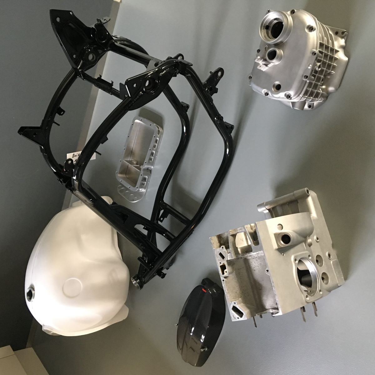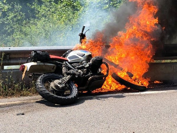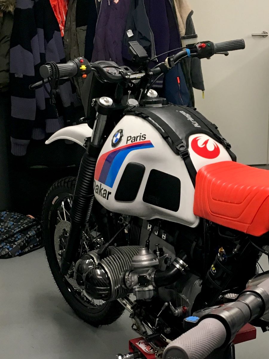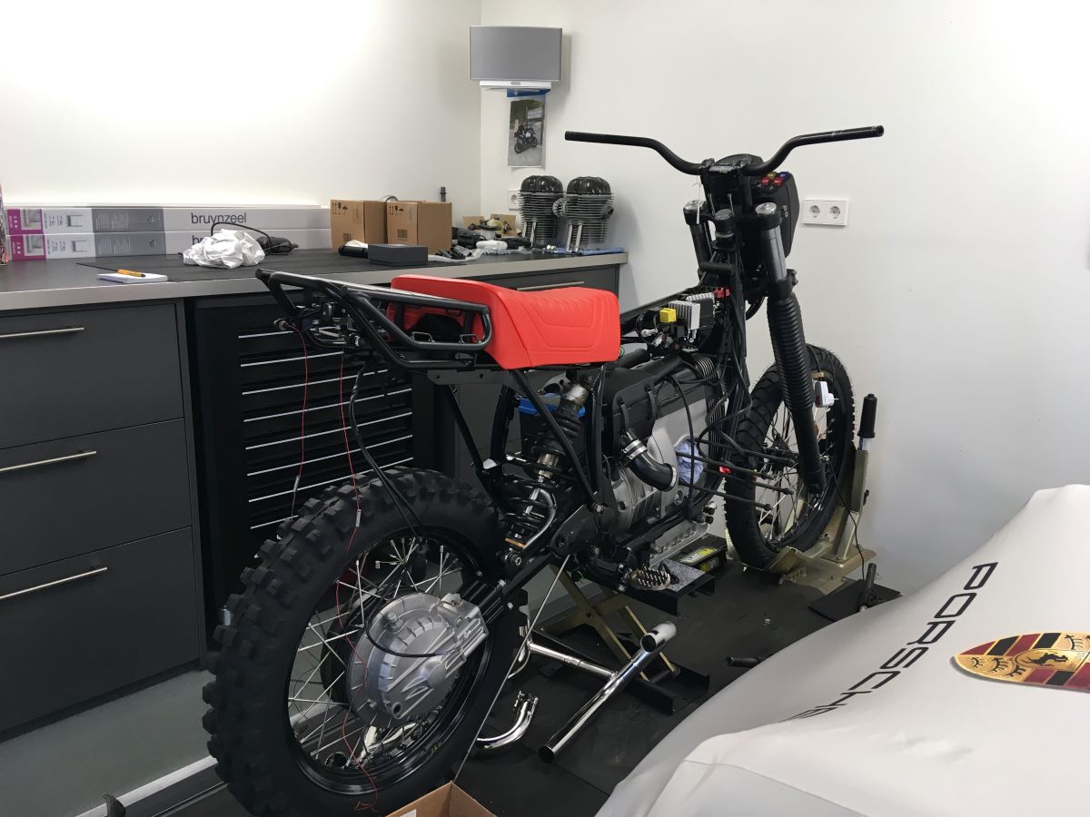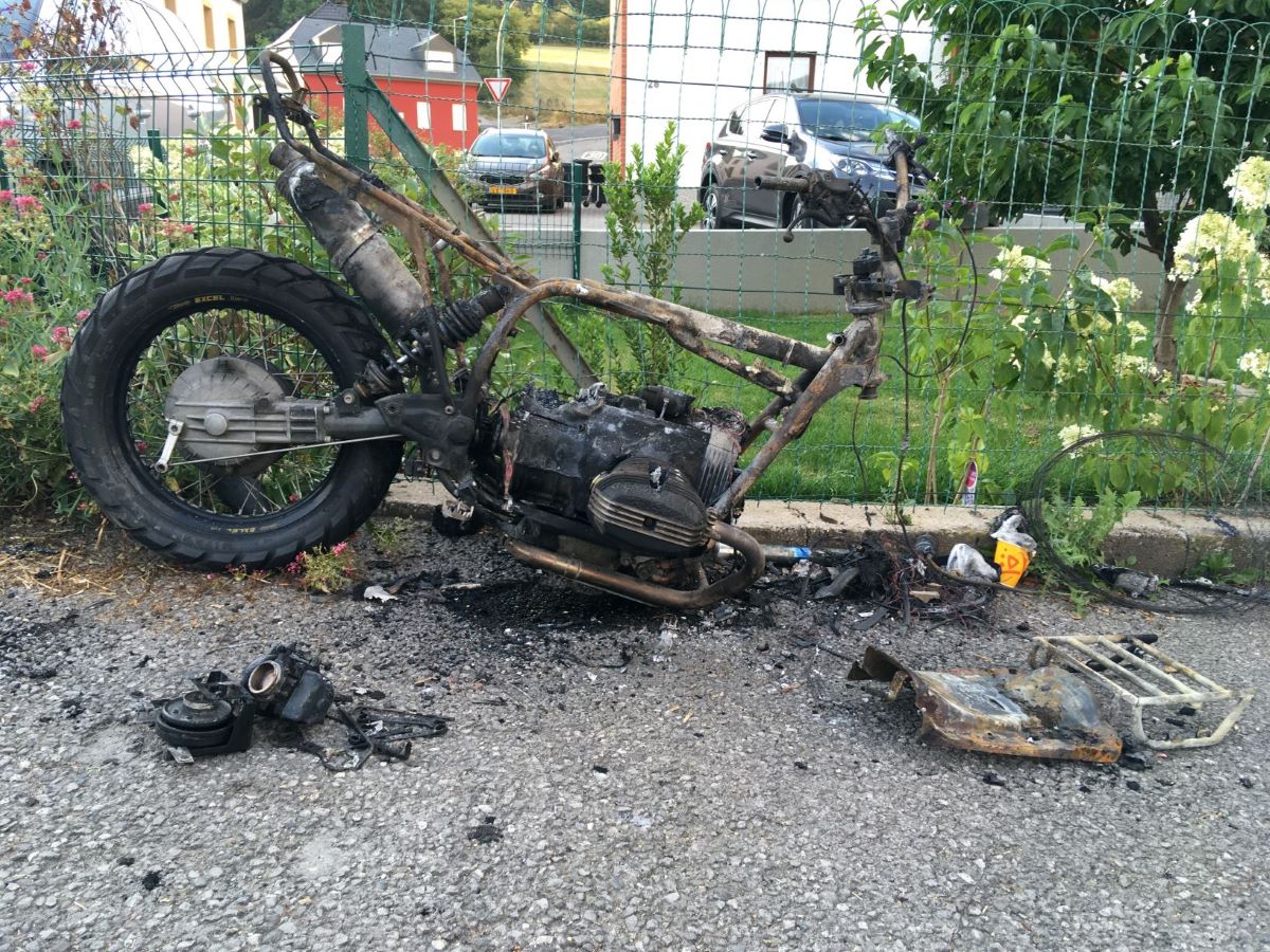 #1142 I have bought this bike as a R80G/S in 2014 for the purpose of allroad travelling. I changed a lot (DRZ frontfork, custom triples, Edelweiss Kraftpaket, TAG +50mm swing, TAG kevlar tank, etc) and got the weight down to 171 kg. I travelled to the Alpes, Belgian Ardennes and Norway. In july 2018 I had an accident in Luxembourg after my throttle got stuck (??). I hit the railing hard and the bike burned down. I had the frame examined by an metalurgist and sent to HPN for repair and reinforcement. The G/S now has HPN number #1142. I rebuild the rest myself and started the bike last week. I mounted the DRZ fork again, it's a better drive than the fork in the #171.