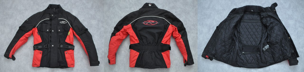 beim Durchsortieren ist die Jacke auf den Bildern im Anhang wieder aufgetaucht: Größe S (das Etikett sagt "Damen", obwohl die Abdeckleiste rechtsrum geknöpft wird), untere Armlänge 47 cm, Rückenlänge 70 cm, vier abgedeckte Außentaschen, eine Innentasche, CE-Protektoren an Schultern und Ellbogen, Rückenprotektor Schaumstoff, Futter fest eingenäht, angeblich wasserdicht, schätzungsweise 10 Jahre alt, sehr guter Zustand, vermutlich auch als Herbst- und Winterjacke brauchbar.