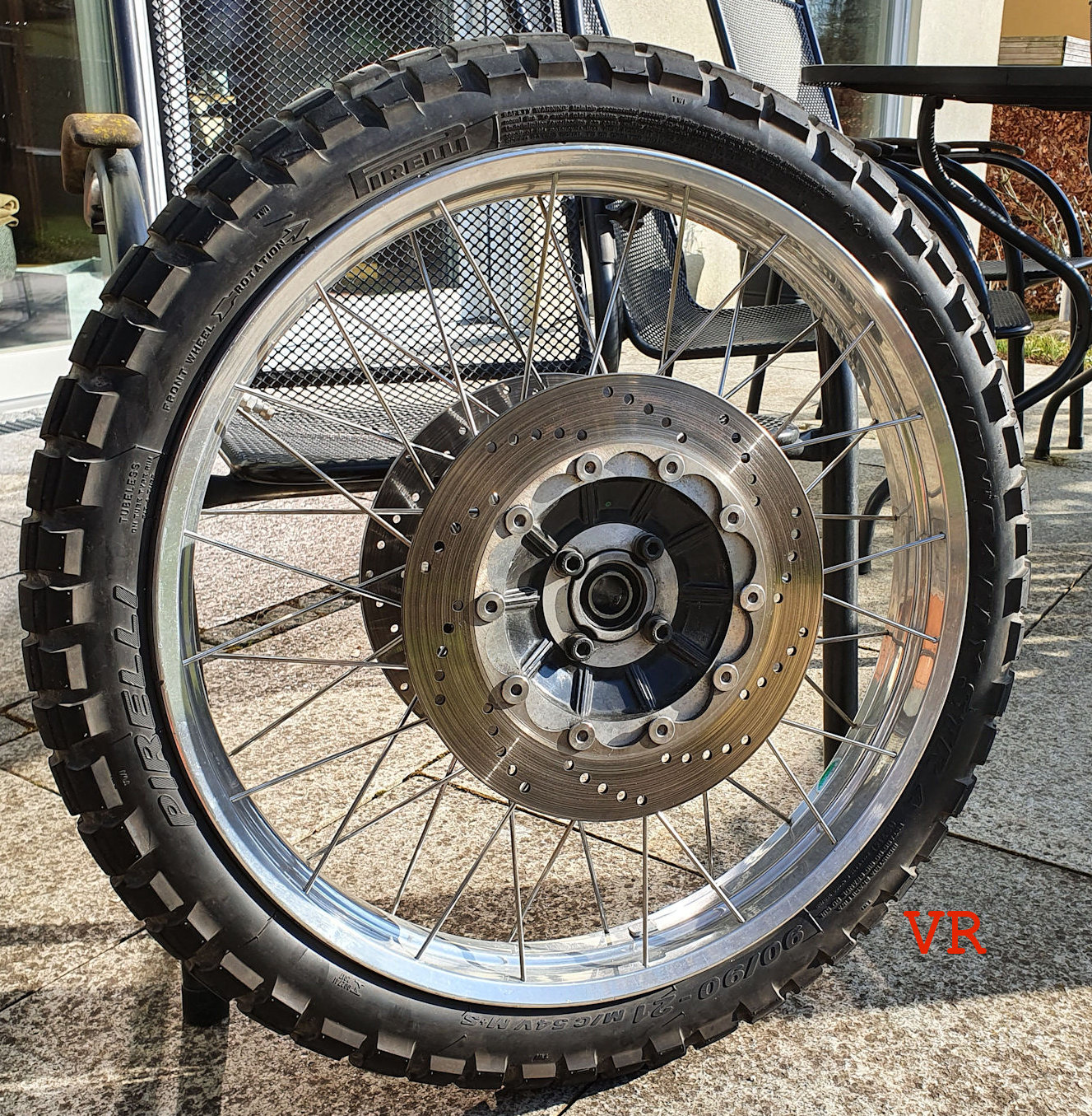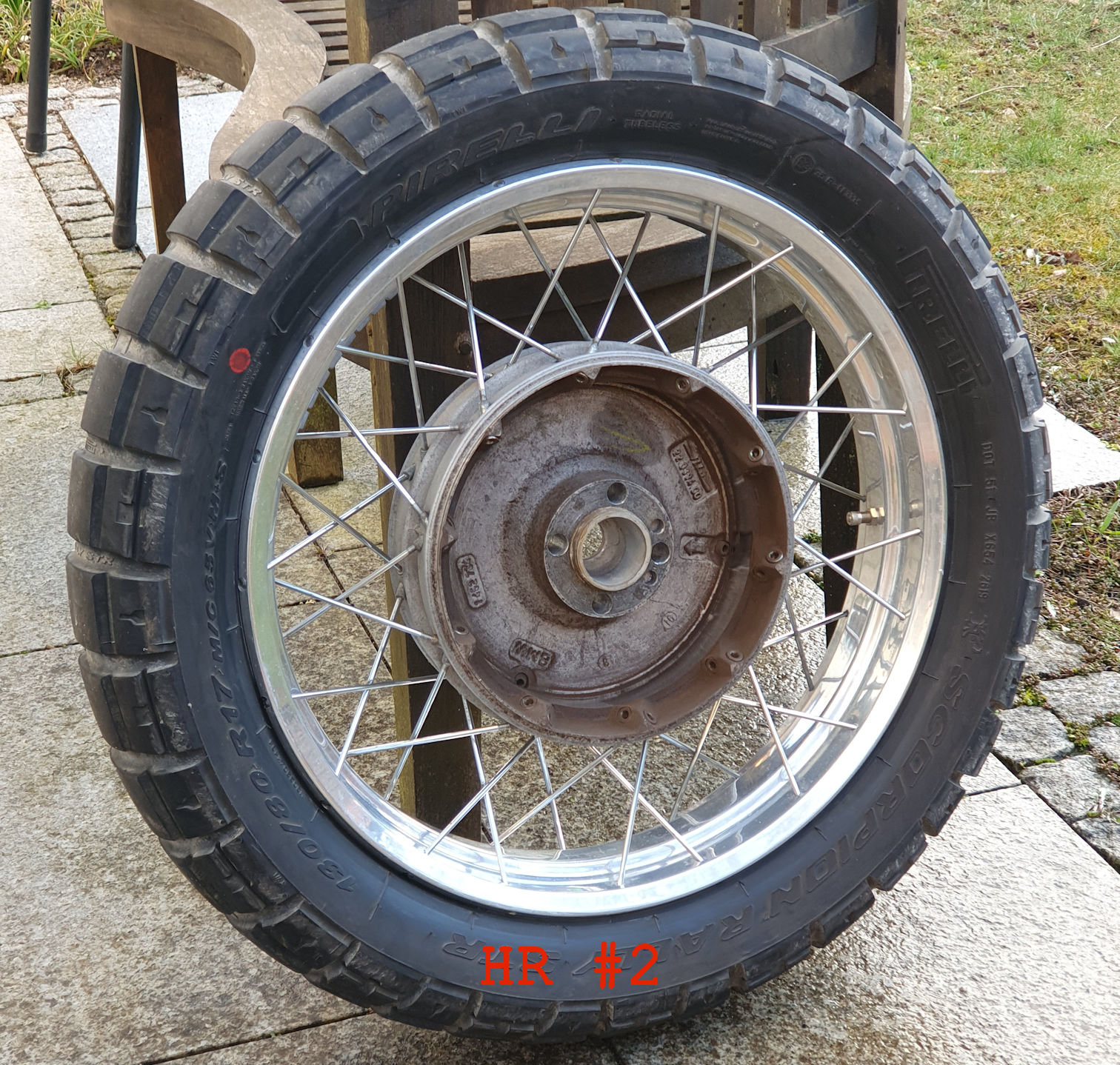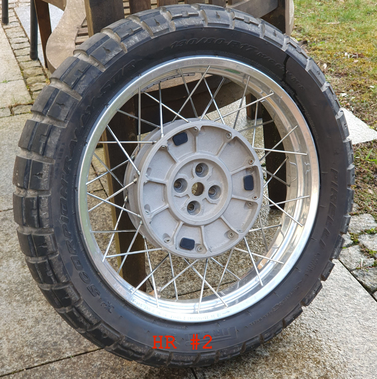 Verkauf aktuell gar nicht geplant, aber auf Anfrage und bei vernünftigem Gebot ebenfalls verfügbar: das zum HR #2 passende Vorderrad: 21" Kreuzspeiche, Doppelscheibe 285 mm BMW Original (die aber nicht mit verkauft werden!), bereift ebenfalls mit Pirelli Scorpion Rally STR mit ca. 2000 km Laufleistung. Falls jemand das HR #2 mit Reifen will, dann lasse ich den Reifen drauf, ansonsten kommt er runter. Dieses Rad ist auf allen Paralever-2V verwendbar.