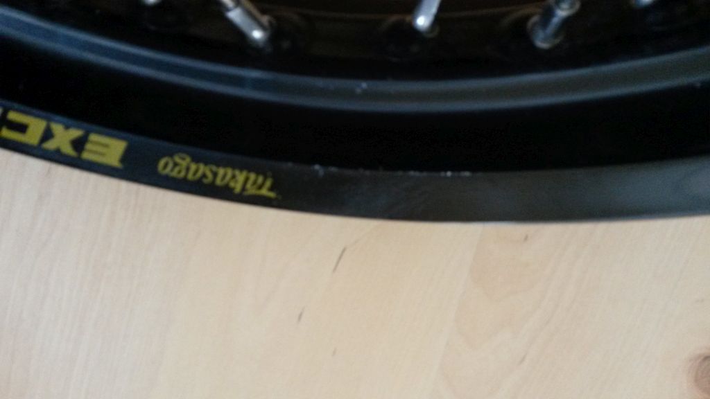 Da ich ein "Wenigfahrer" bin sind die Felgen seit dem Neuaufbau erst ca. 4000 gelaufen. Dementsprechend gut ist ihr Zustand. Die Vorderradfelge würde ich als neuwertig bezeichnen. Die Hinterradfelge hat einen kleinen Schönheitsfehler (vgl. Foto) aber nichts dramatisches - sonst top.